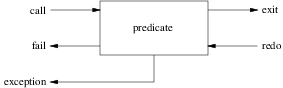 The procedure box model of Prolog execution provides a simple way to show the control flow. This model is very popular and has been adopted in many Prolog systems (e.g. SICStus Prolog, Quintus Prolog,…). A good introduction is the chapter 8 of “Programming in Prolog” of Clocksin & Mellish [2]. The debugger executes a program step by step tracing an invocation to a predicate (call) and the return from this predicate due to either a success (exit) or a failure (fail). When a failure occurs the execution backtracks to the last predicate with an alternative clause. The predicate is then re-invoked (redo). Another source of change of the control flow is due to exceptions. When an exception is raised from a predicate (exception) by throw/1 (section 7.2.4) the control is given back to the most recent predicate that has defined a handler to recover this exception using catch/3 (section 7.2.4). The procedure box model shows these different changes in the control flow, as illustrated here: